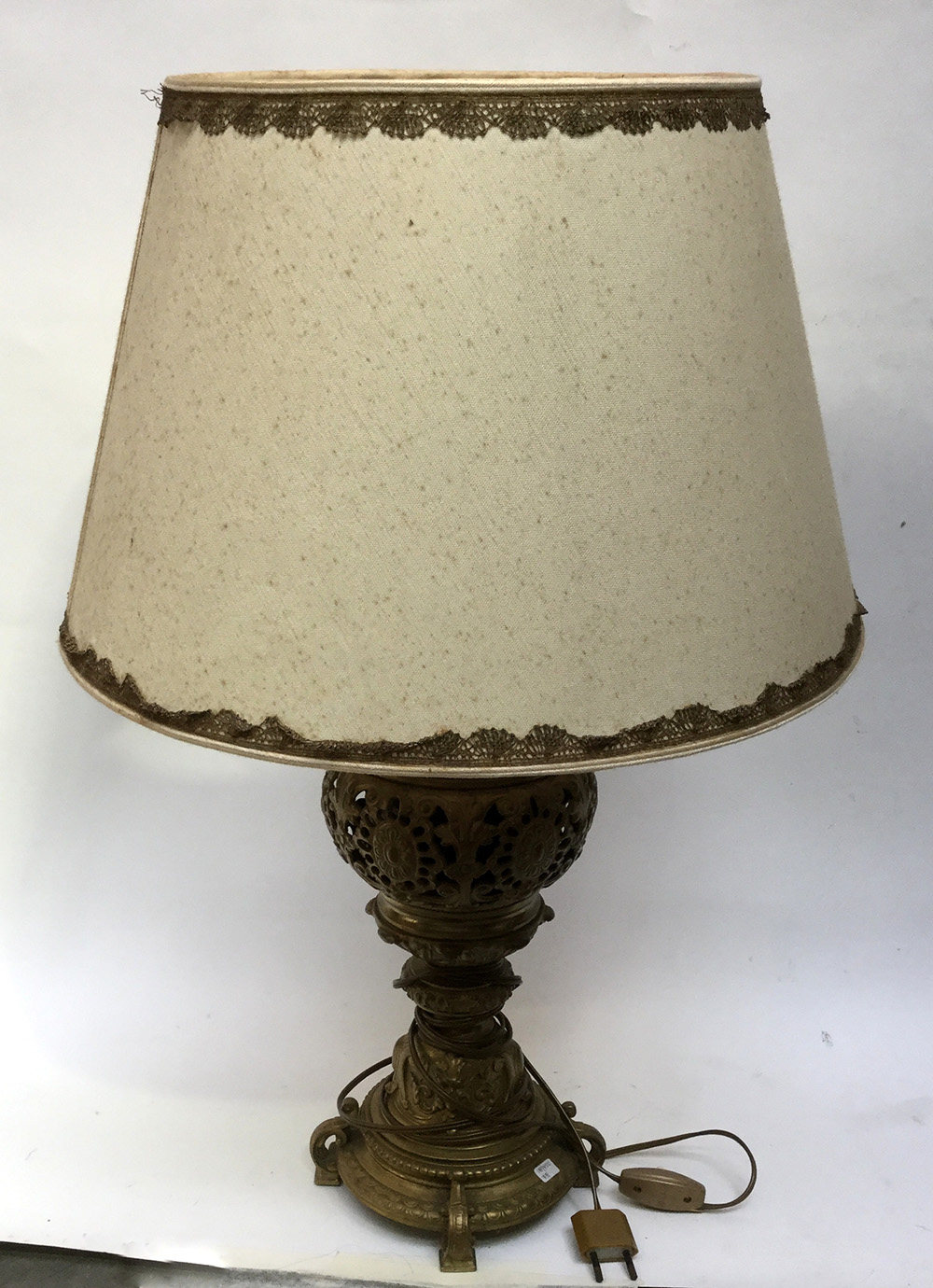 Lampada da tavolo ad una luce con corpo in bronzo traforato e decorato a volute e mascheroni, completo di paralume (h cm 62) (difetti)