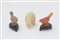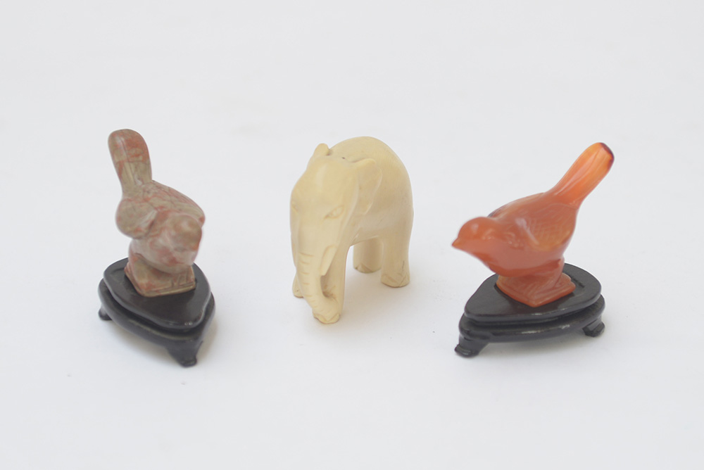 Lotto composto da due sculturine in pietra dura raffiguranti uccelli su base in legno e un elefantino in avorio