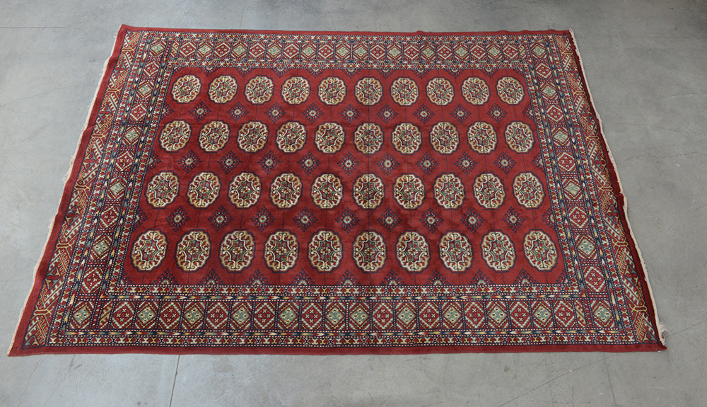 Tappeto meccanico con disegno Bohukara su fondo rosso, sec. XX (cm 337x233) (difetti)