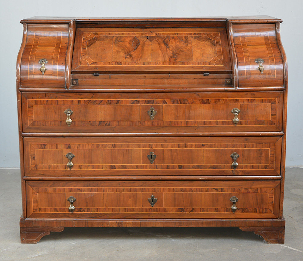 Ribalta interamente lastronata in ulivo e radica di ulivo e filettata in legno chiaro, parte superiore con anta ribaltabile celante quattro cassettini e sportello e due grandi cassetti sagomati laterali. Parte inferiore a tre cassetti, Verona secolo XVIII (cm 138x117x63)(difettie restauri)