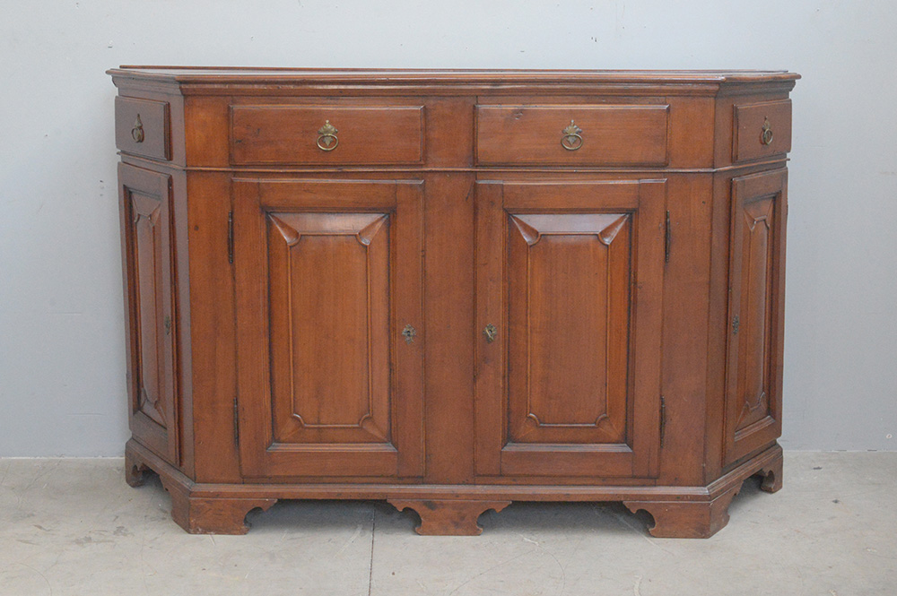 Credenza scantonata in noce a quattro casetti in linea sottopiano e quattro ante riquadrate sul fronte. Piedi a mensola, secolo XIX (cm 170x115x55) (difetti)