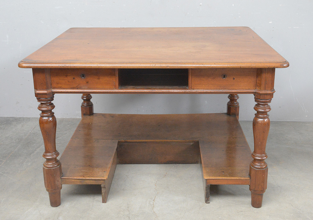 Scrivania da centro in noce con cassetti nella fascia e gambe tornite riunite da piano inferiore sagomato. Secolo XIX (cm 133x84x114) (difetti e mancanze)