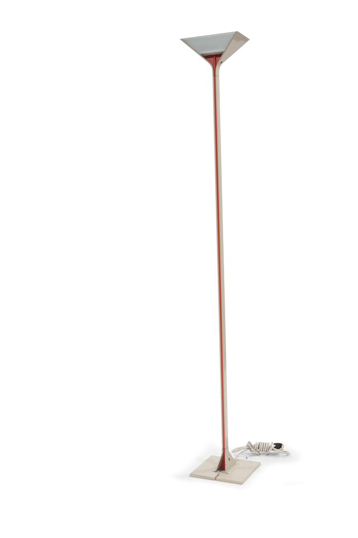 Lampada da terra alogena con struttura in alluminio laccato e diffusori in vetro.