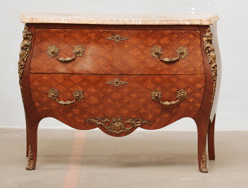 Com? bombato a due cassetti con intarsi a fiori e losanghe, guarnizioni in...