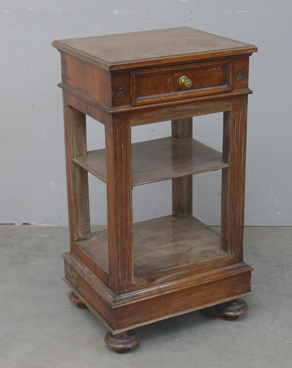 Comodino ad un cassetto sottopiano e due vani a giorno. Piedi torniti (cm 44x80x36)