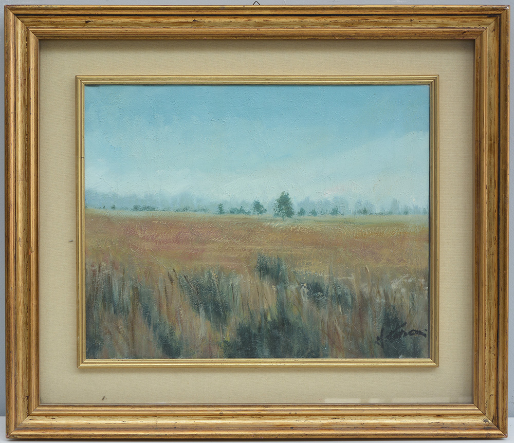 Firma indecifrata, "Campo di grano" olio su tela (cm 40x50) firmato in basso a destra e al verso, in cornice (lievi difetti)