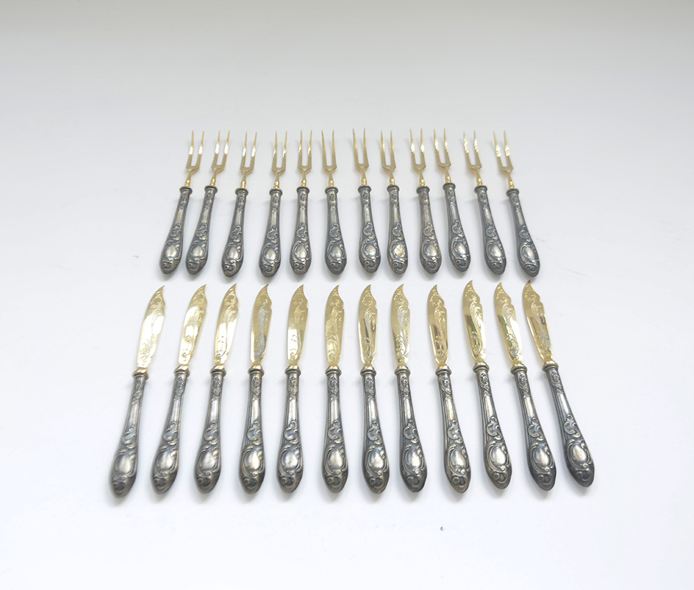 Servizio da dolce per dodici persone con manici in lamina d'argento decorato a motivi Liberty (difetti)