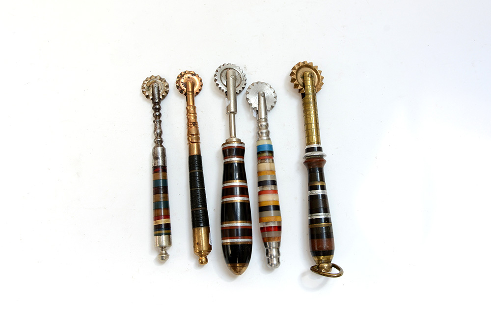 Lotto composto da cinque rondelle da pasta in metallo con inserti a disco in vari materiali (Landini p. 97) -EN Five metal pastry jiggers with multiple material disk handles (Landini p. 97)