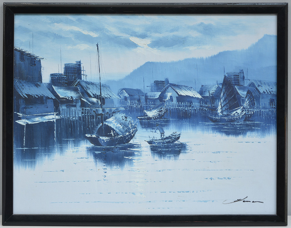 Firma indecifrata, "Porto con pescatori" olio su tela (cm 46x60) firmato in basso a destra, in cornice