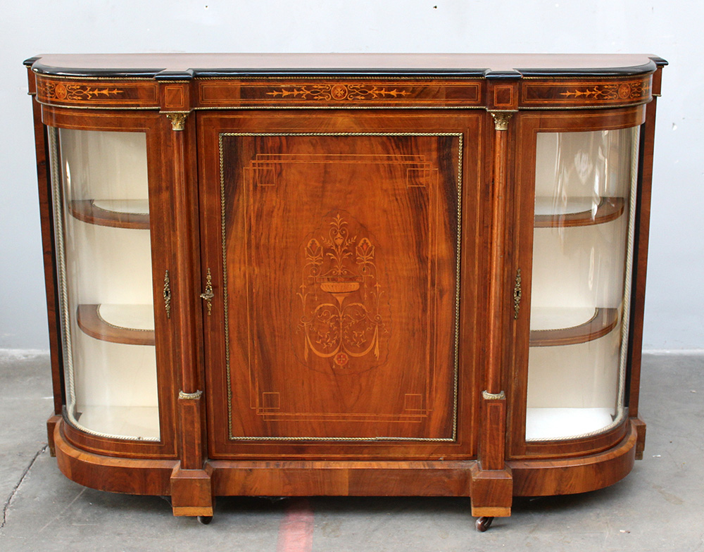 Credenza con grande sportello centrale e due vetrine laterali decorata con colonnine, filettature, piccoli intarsi e guarnizioni in metallo (cm 150x106x41) (difetti)