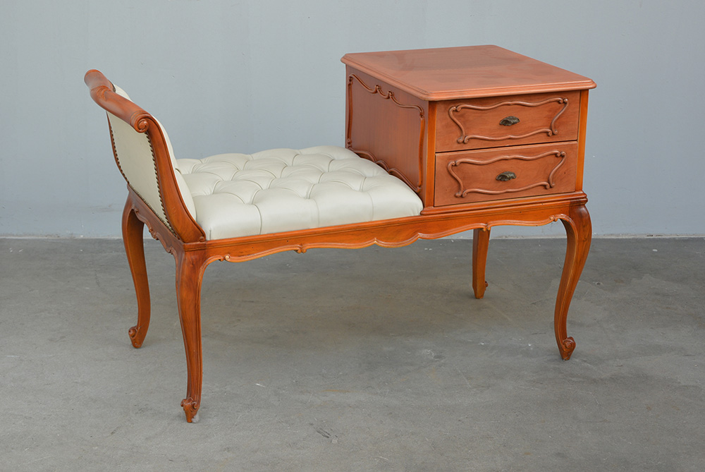 Panchetto con piano porta telefono e due cassetti, gambe mossa e seduta rivestita in pelle (cm 106x68x50) (difetti)