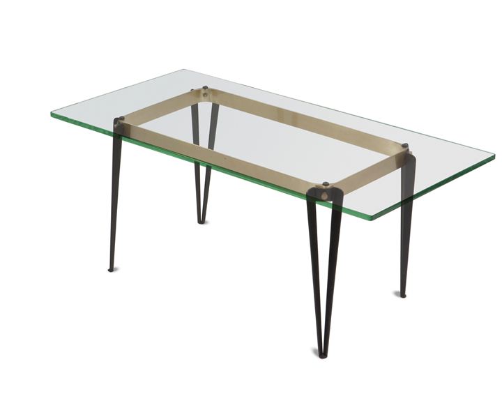 TAVOLINO Tavolino con piano in cristallo e base in ottone zapponato. 1960...