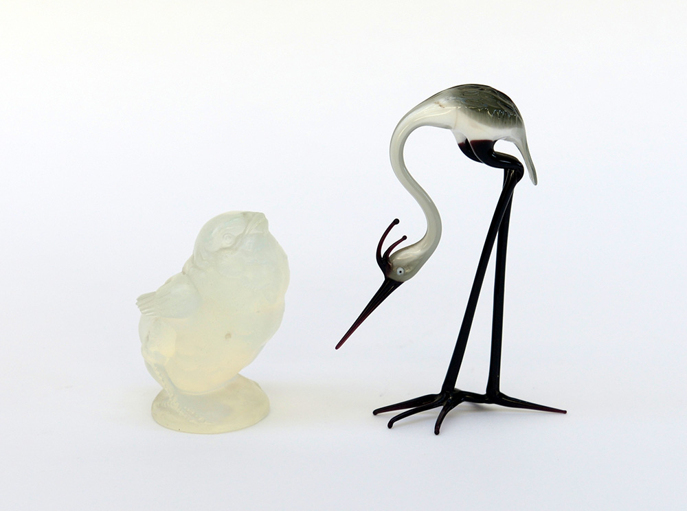 Due sculture in vetro di cui una firmata a punta Sabinot sotto la base, l'altra raffigurante una cicogna. (difetti) -EN Due sculture in vetro di cui una firmata a punta Sabinot sotto la base, l'altra raffigurante una cicogna. (difetti)
