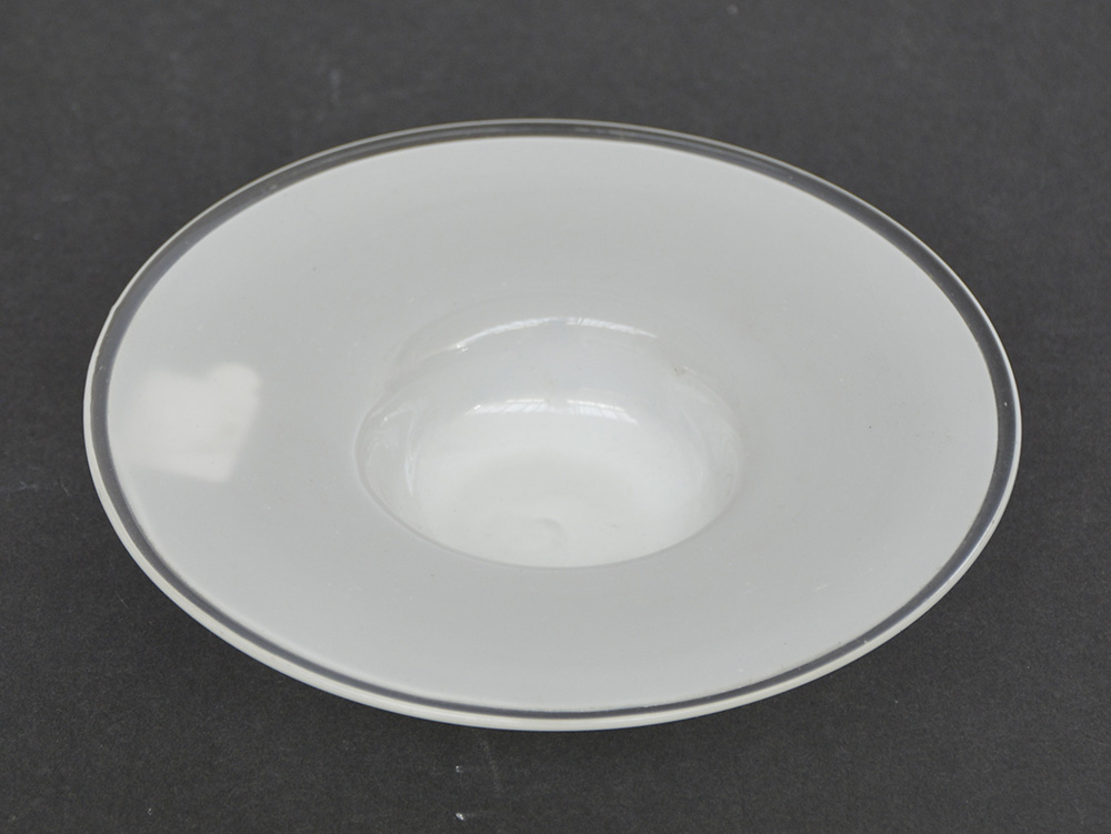 Manifattura di Murano. Piattino bomboniera in vetro soffiato lattimo con orlo applicato in vetro trasparente -EN Piattino bomboniera in vetro soffiato lattimo con orlo applicato in vetro trasparente. Anni '70ca. (d cm 14,5)