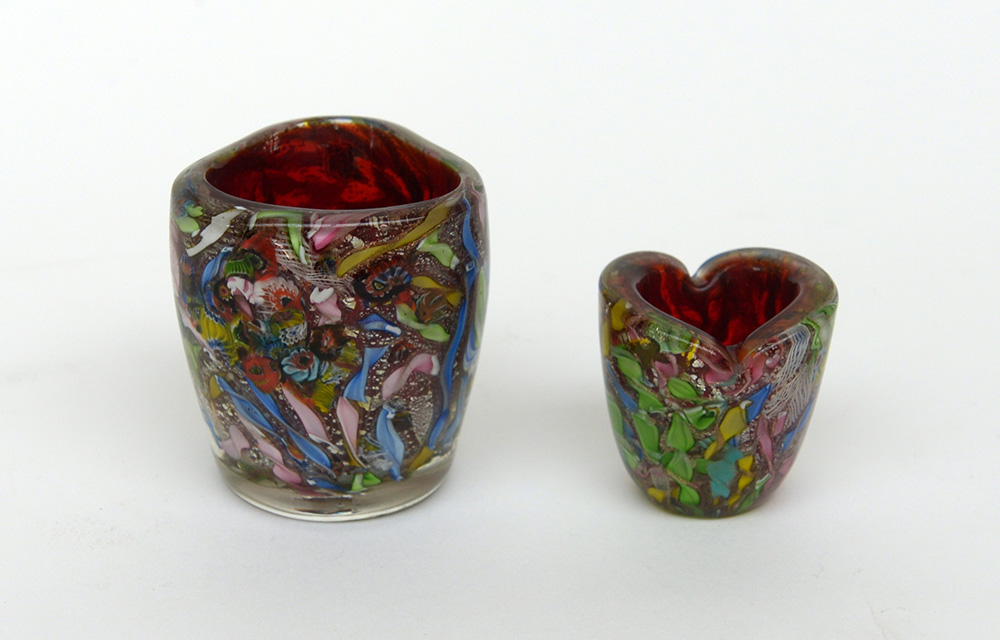 Manifattura di Murano Lotto composto da due ciotole in vetro sommerso incolore e rosso con inclusione di murrine multicolore. Seconda metà secolo XX. -EN Manifattura di Murano Lotto composto da due ciotole in vetro sommerso incolore e rosso con inclusione di murrine multicolore. Seconda metà secolo XX.