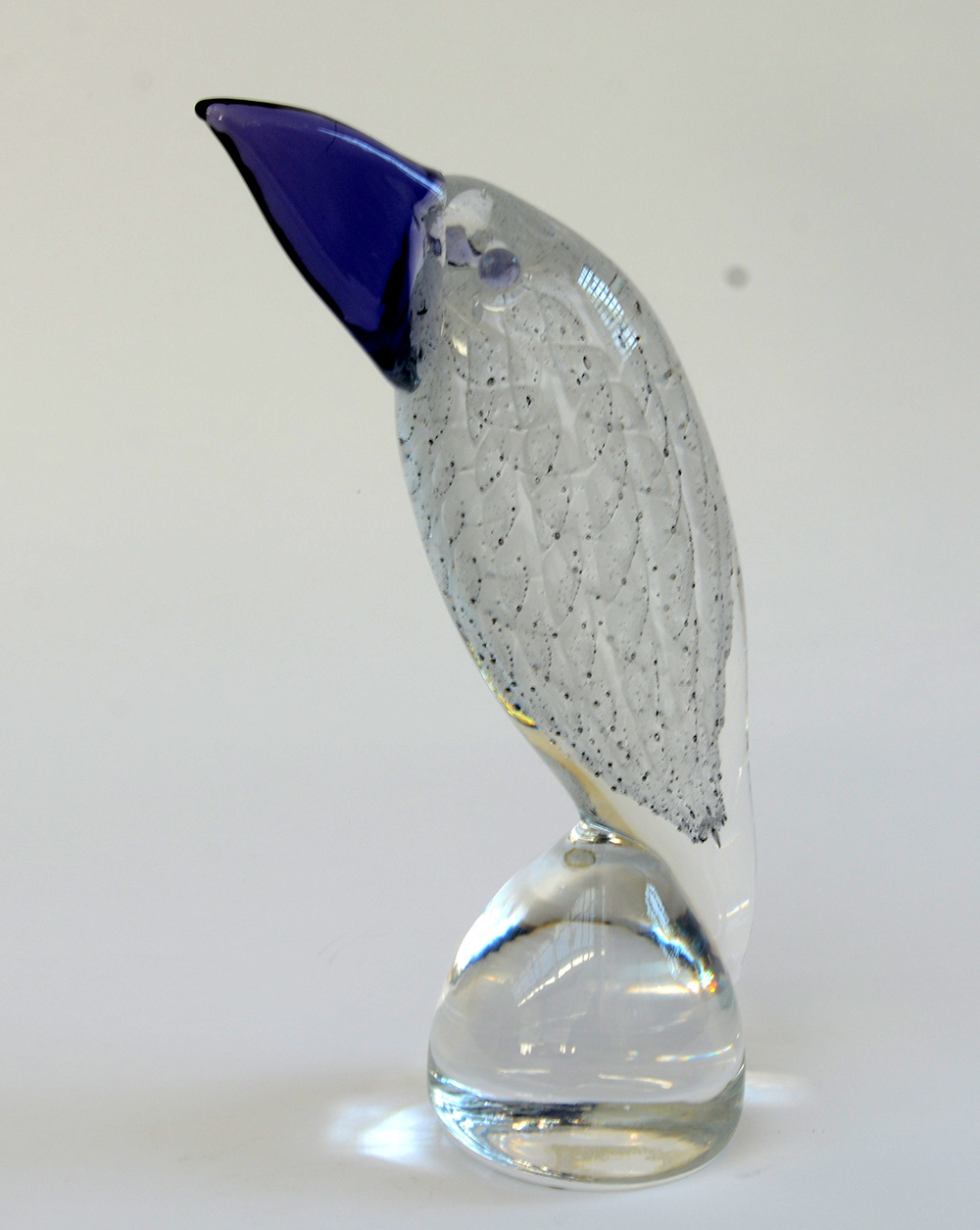Manifattura di Murano. "Tucano" Scultura in vetro sommerso incolore, ametista chiaro e a fasce ritorte opalescenti a bolle. -EN Manifattura di Murano. "Tucano" Scultura in vetro sommerso incolore, ametista chiaro e a fasce ritorte opalescenti a bolle.