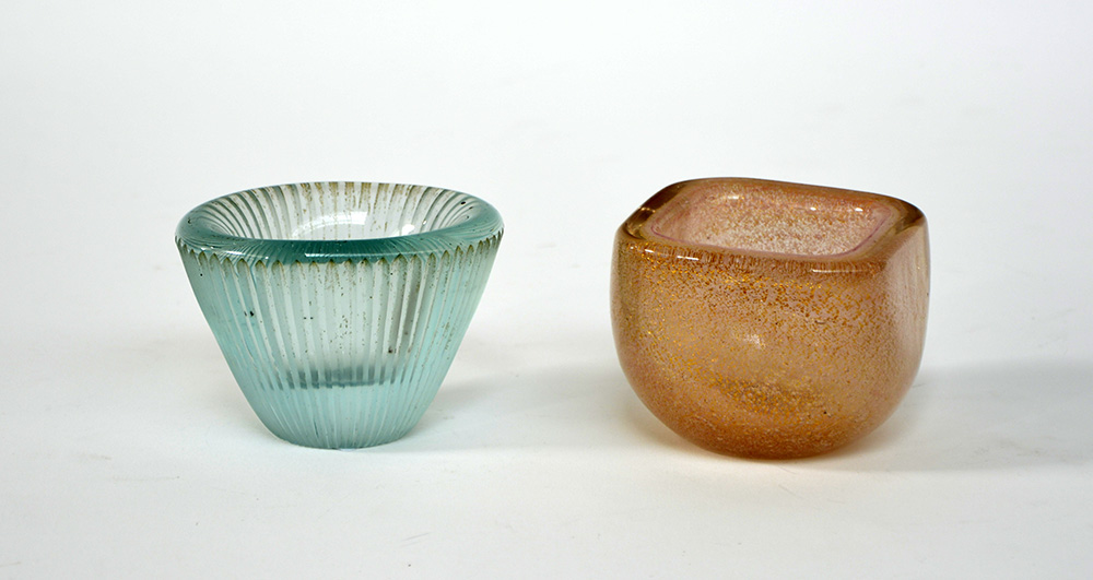 Lotto composto da una bomboniera in vetro soffiato rosino con incluisone di bolle e foglia d'oro di manifattura muranese unito a una bomboniera in vetro verdino inciso a costolature verticali. Italia, secolo XX. (lievi difetti) -EN Lotto composto da una bomboniera in vetro soffiato rosino con incluisone di bolle e foglia d'oro di manifattura muranese unito a una bomboniera in vetro verdino inciso a costolature verticali. Italia, secolo XX. (lievi difetti)