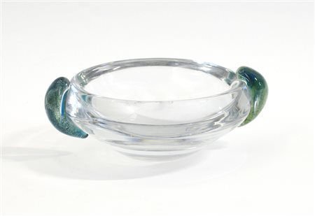 Daum Ciotola in vetro soffiato incolore di forte spessore con morise applicate in vetro sommerso celeste e verde a bolle. Nancy, Francia, seconda metà secolo XX. (d cm 20,5) -EN Colourless blown glass bowl with morises applied in light blue and green bubble glass. Nancy, France, second half 20th century. (d 20.5 cm.)