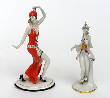Lotto di due sculture déco in ceramica raffiguranti danzatrici. 1925 circa (h max cm 19) (difetti e restauri) -EN Lotto di due sculture déco in ceramica raffiguranti danzatrici. 1925ca. (difetti e restauri)