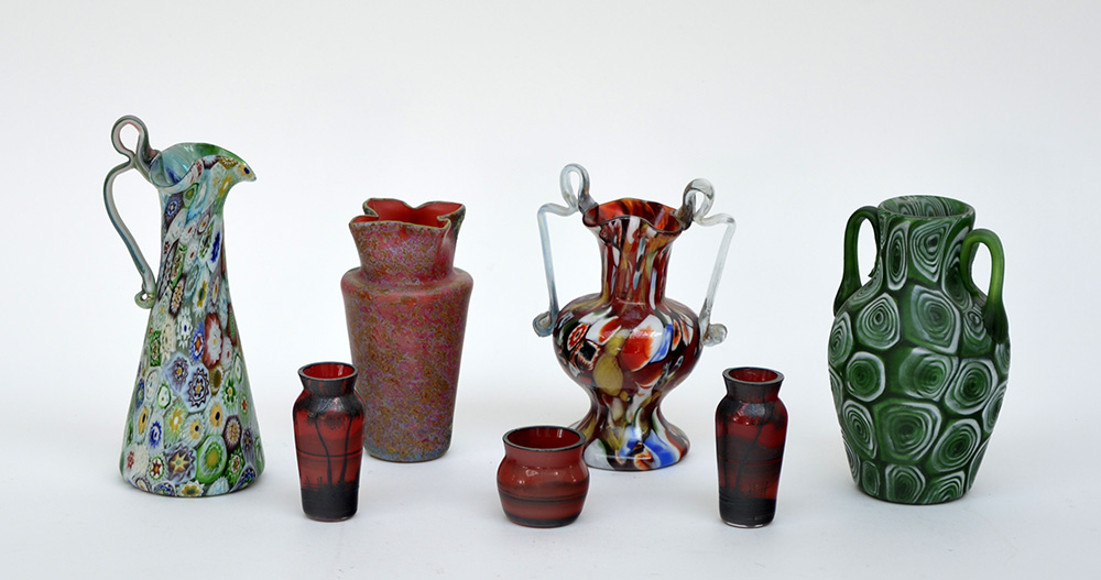 Lotto composto da tre vasi in vetro soffiato a murrine di manifattura muranese unito a quattro vasi in pasta vitrea dipinta a mano di manifattura francese. Secolo XX. (lievi difetti) -EN Lotto composto da tre vasi in vetro soffiato a murrine di manifattura muranese unito a quattro vasi in pasta vitrea dipinta a mano di manifattura francese. Secolo XX. (lievi difetti)