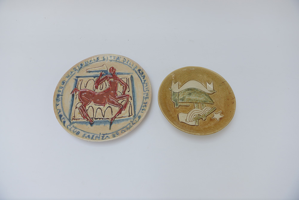 Lotto composto da un piatto di Matteucci in ceramica decorato a rilievo e con smalti rossi, blu e beige con figura di cerntauro eseguito per il Moto Club di Faenza nel 1956, unito a un piatto in ceramica decorato a rilievo con una barca stilizzata alla maniera di Giovanni Gariboldi recante il timbro dell'istituto Industriale per la Ceramica di Milano negli anni 30. (lievi difetti) -EN Lotto composto da un piatto di Matteucci in ceramica decorato a rilievo e con smalti rossi, blu e beige con figura di cerntauro eseguito per il Moto Club di Faenza nel 1956, unito a un piatto in ceramica decorato a rilievo con una barca stilizzata alla maniera di Giovanni Gariboldi recante il timbro dell'istituto Industriale per la Ceramica di Milano negli anni 30. (lievi difetti)