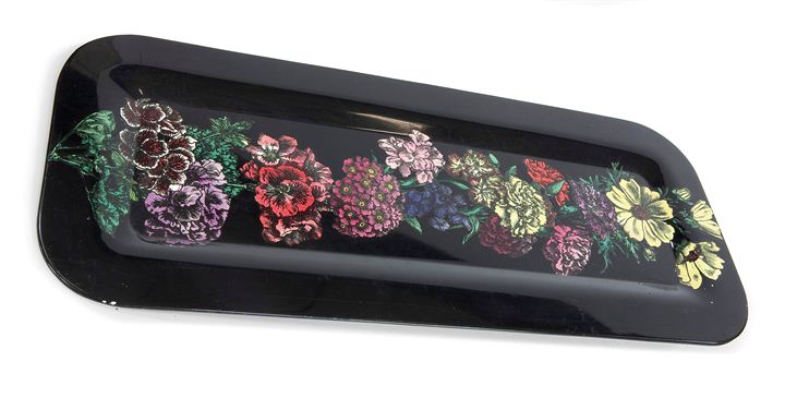 FORNASETTI PIERO Vassoio in lamiera con decoro floreale a serigrafia....