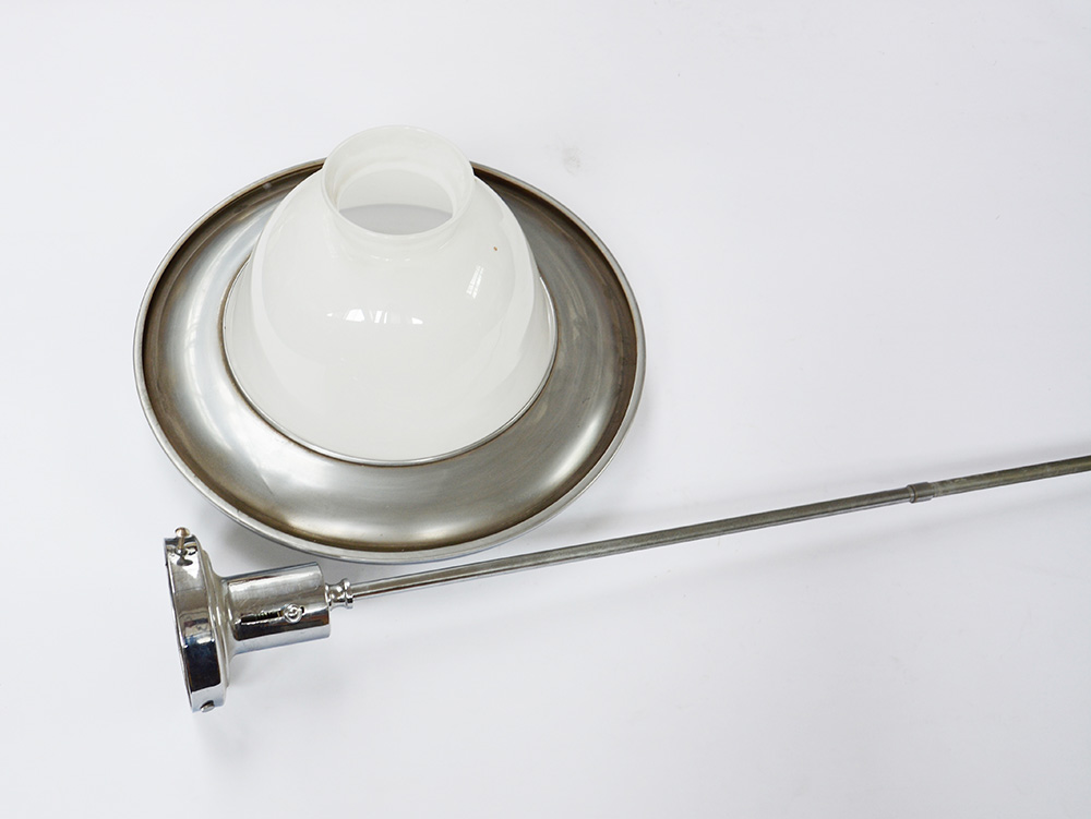 Lampadario a una luce con struttura in alluminio e diffusore in vetro lattimo. Italia, anni '70. (d cm 45) (lievi difetti) -EN Lampadario a una luce con struttura in alluminio e diffusore in vetro lattimo. Italia, anni '70. (d cm 45) (lievi difetti)