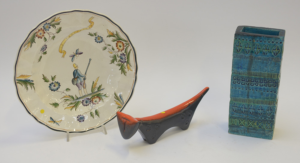 Lotto composto da un piatto di Gio Ponti della serie "Ermione" per Richard Ginori S. Cristoforo unito a un vaso e a una scultura di gatto stilizzato di Aldo Londi per Bitossi in ceramica scalfita in verde-blu, grigio- arancione. Italia, secolo XX. (difetti e restauri) -EN Lotto composto composto da un piatto di Gio Ponti della serie "Ermione" per Richard Ginori S. Cristoforo unito a un vaso e a una scultura di gatto stilizzato di Aldo Londi per Bitossi in ceramica scalfita in verde-blu, grigio- arancione. Italia, secolo XX. (difetti e restauri)