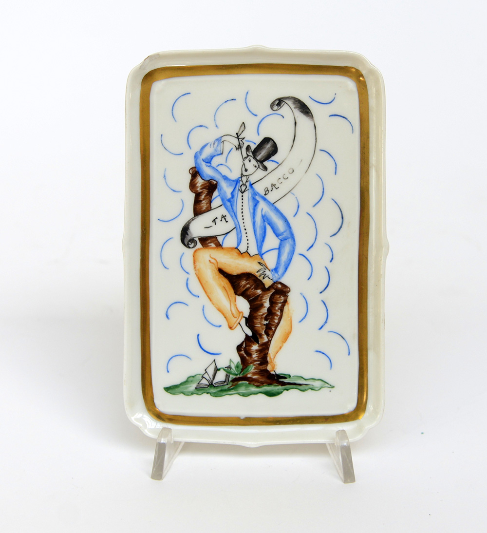 Vassoietto in ceramica decorato nello stile di Gio Ponti con allegoria del tabacco. Milano, 1930. Firmato e datato "Vivi Prati 1930". -EN Vassoietto in ceramica decorato nello stile di Gio Ponti con allegoria del tabacco. Milano, 1930. Firmato e datato "Vivi Prati 1930".