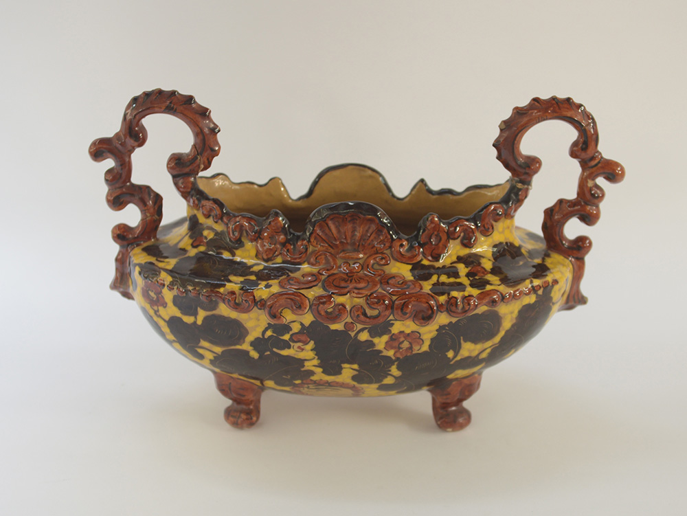 Manifattura C.A.S. Centrotavola in terracotta maiolicata dipinta in policromia. Savona, anni '30. Marcato sotto la base con il monogramma della manifattura e il numerale 44. (l cm 45,5) (difetti, restauri e mancanze)