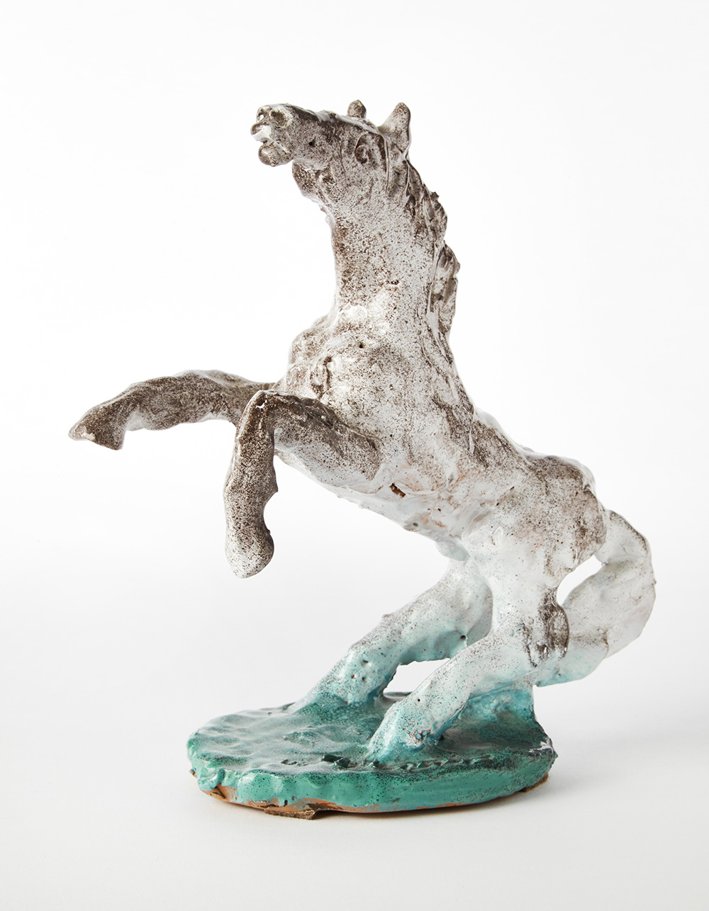 Umberto Ghersi (Albisola 1913 - Albisola 1993) "Cavallo" Scultura in terracotta smaltata in policromia sotto vetrina. Albisola, anni '80. Firmata alla base e sotto la base e recante etichetta con firma autentica dell'autore sotto la base. (h cm 24,5) (lievi difetti) -EN "Cavallo" Terracotta polychrome underglaze sculpture. Albisola, 1980s. Signed under the base and bearing the label with the author's authentic signature under the base. (h 24.5 cm.) (slight defects)