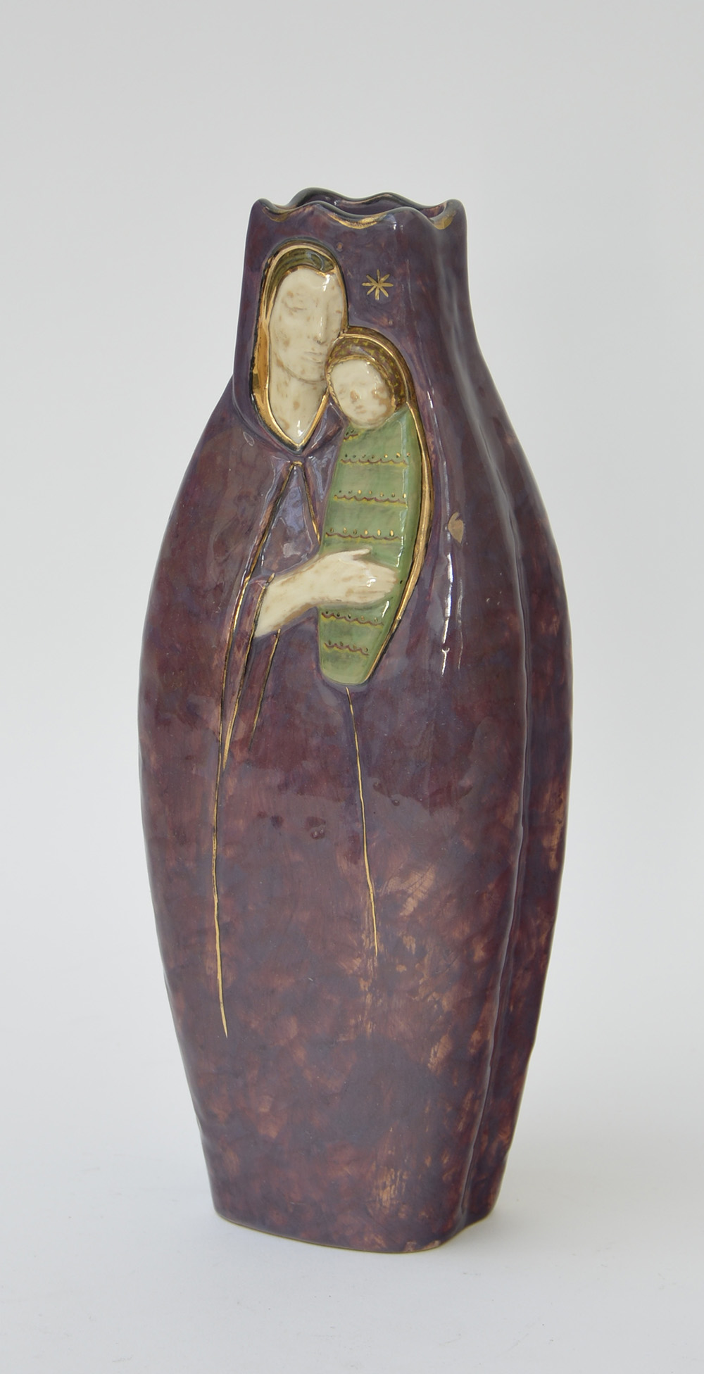 Vaso portafiori in ceramica smaltata ametista sottovetrina e decorata a bassorilievo con Madonna e Bambino profilata in oro. Produzione Gatti, Faenza, anni '30. (lievi difetti) -EN Vaso portafiori in ceramica smaltata ametista sottovetrina e decorata a bassorilievo con Madonna e Bambino profilata in oro. Produzione Gatti, Faenza, anni '30. (lievi difetti)