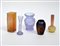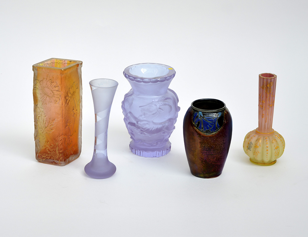Lotto composto da un piccolo vaso in ceramica smaltata a lustri metallici e decorato a rilievo con motivi Art déco firmato alla base Barol, Francia 1925 circa, unito a quattro piccoli vasi in vetro di diverse manifatture tra cui un vaso parallelepipedo in vetro inciso all'acido con decori vegetali parzialmente dorati della manifattura Daum di Nancy. (difetti) -EN Lotto composto da un piccolo vaso in ceramica smatato a lustri metallici e decorato a rilievo con motivi Art déco firmato alla base Barol, Francia 1925 circa, unito a quattro piccoli vasi in vetro di diverse manifatture tra cui un vaso parallelepipedo in vetro inciso all'acido con decori vegetali parzialmente dorati della manifattura Daum di Nancy. (difetti)