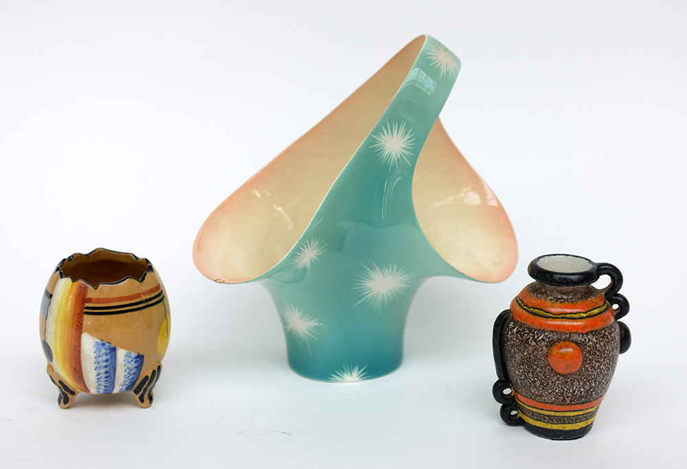 Lotto composto da due vasetti futuristi smaltati in policromia e all'aereografo della manifattura M.G.A. di Albisola uniti a un vaso con manico in cermica smaltata in verde sotto vetrina della manifattura VIBI di Torino. Secolo XX. (Lievi difetti e piccoli restauri) -EN Lotto composto da due vasetti futuristi smatata in policromia e all'aereografo della manifattura M.G.A. di Albisola uniti a un vaso con manico in cermica smaltata in verde sotto vetrina della manifattura VIBI di Torino. Secolo XX. (Lievi difetti e piccoli restauri)