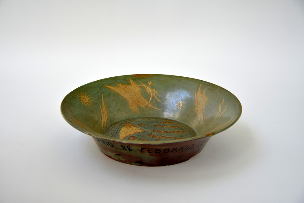 Pietro Melandri (Faenza 1885 - Faenza 1976) Alzata in ceramica smaltata verde e beige con decorazioni a rilievo raffiguranti navi e la volta celeste. Superficie esterna smaltata in verde, ametista e a lustro metallico. Faenza, anni '50/'60. (d cm 31) (difetti e restauri) -EN Alzata in ceramica smaltata verde e beige con decorazioni a rilievo raffiguranti navi e la volta celeste. Superficie esterna smaltata in verde, ametista e a lustro metallico. Faenza, anni '50/'60. (d cm 31) (difetti e restauri)