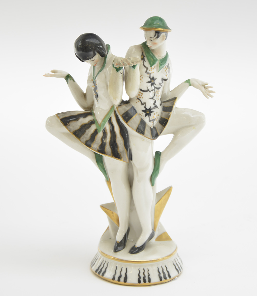 Schwarzburger Werkstatten fur Porzellankunst Gruppo in porcellana Art déco dipinto in nero, verde e oro raffigurante una coppia di danzatori. Germania, 1925. (Difetti, mancanze e restauri) -EN Schwarzburger Werkstatten fur Porzellankunst Gruppo in porcellana Art déco dipinto in nero, verde e oro raffigurante una coppia di danzatori. Germania, 1925. (Difetti, mancanze e restauri)