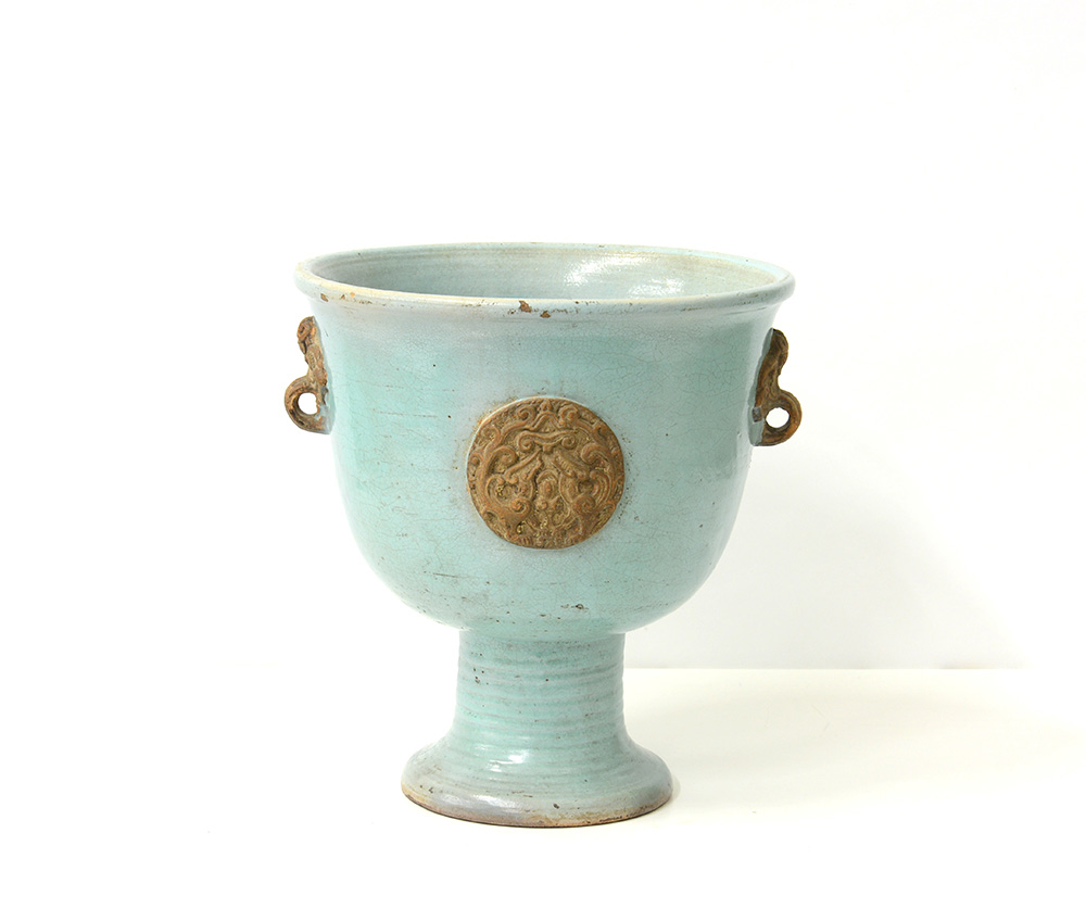 Zaccagnini Vaso in ceramica smaltato verde acqua e decorato con anse e medaglioni a rilievo. Italia, anni '30. (h cm 34,5; d cm 32) (lievi difetti e restauri) -EN Vaso in ceramica smaltato verde acqua e decorato con anse e medaglioni a rilievo. Italia, anni '30. (h cm 34,5; d cm 32) (lievi difetti e restauri)