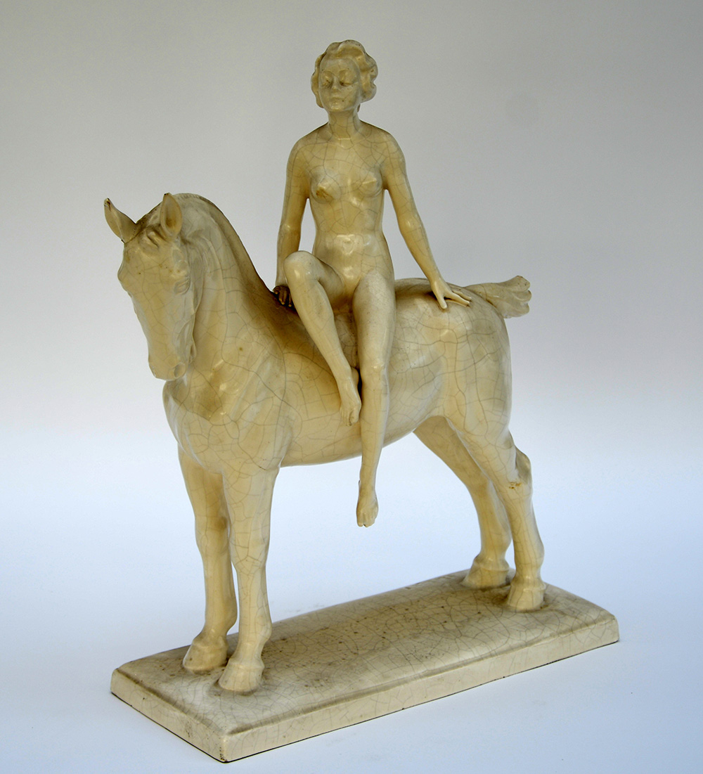 Max Ungher "Amazzone" Scultura in ceramica formata a colaggio e smaltata in bianco opaco a craquele. Anni '30. (lievi difetti e restauri) -EN "Amazzone" Scultura in ceramica formata a colaggio e smaltata in bianco opaco a craquele. Anni '30. (lievi difetti e restauri)