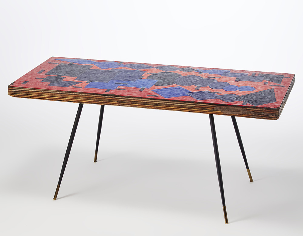 Tavolo basso con piano rivestito da un pannello in rame smaltato in policromia con soggetto astratto. Struttura in metallo verniciato nero. Italia, anni '50/'60. (cm 100x45x45) (difetti) -EN Coffee table with top in polychrome glazed copper decorated with abstract subject. Italy, A50/60. (100x45x45 cm.) (defects)