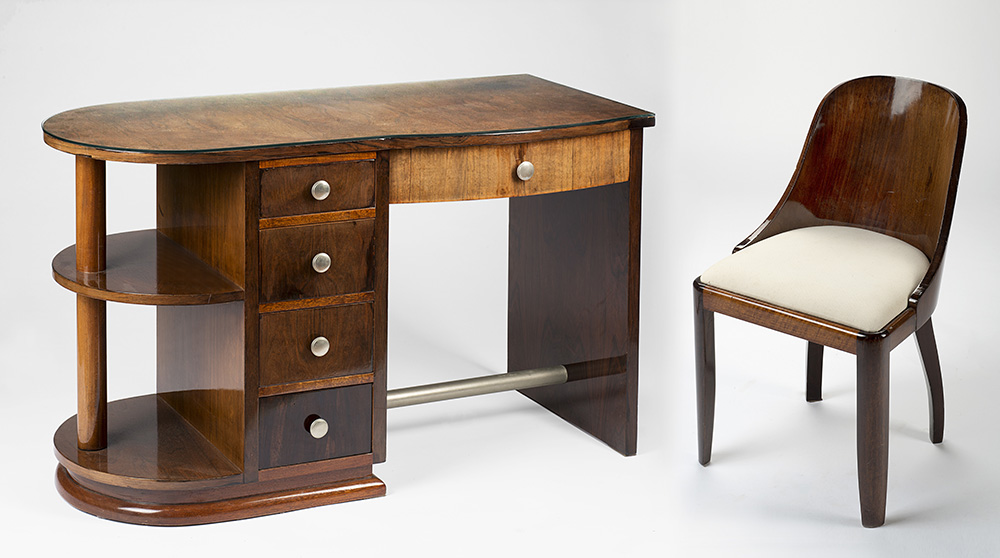 Scrivania di gusto déco a quattro cassetti verticali, uno sottopiano e ripiani a giorno di forma semicircolare, con struttura impiallacciata in legno, maniglie in metallo nichelato e sovrapiano in vetro. Unita a una sedia di gusto déco con struttura in legno massello, schienale impiallacciato e seduta rivestita in tessuto color canapa. Secolo XX. (scrivania: cm 125x76x60; poltrona: cm 48x79x48) (lievi difetti e restauri) -EN Déco-style desk with four drawers and shelves, veneered structure, metal handles and glass top. United to a Déco-style chair with wood structure, veneered seatback and fabric covering. 20th century. (desk: cm 125x76x60; armchair: cm 48x79x48) (slight defects and restoration)