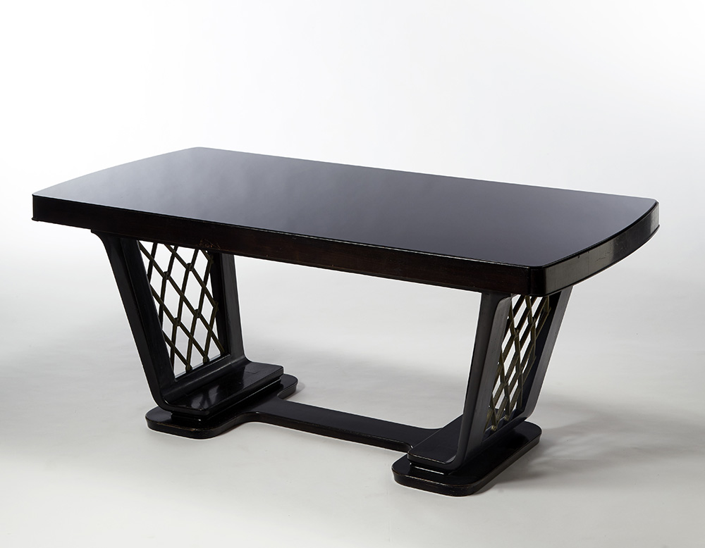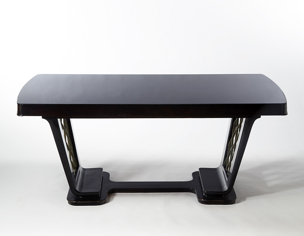 Tavolo in stile Novecento in legno ebanizzato con gambe a slitta decorate da griglie in legno intagliato e dorato e piano in opalina nera. Completo di prolunghe. Italia, anni '20/'30. (cm 189x80x94) (lievi difetti e restauri) -EN Novecento table with ebonized wood structure and black opaline top. Equipped with extension elements. Italy, 1920s/1930s. (189x80x94 cm.) (slight defects and restoration)