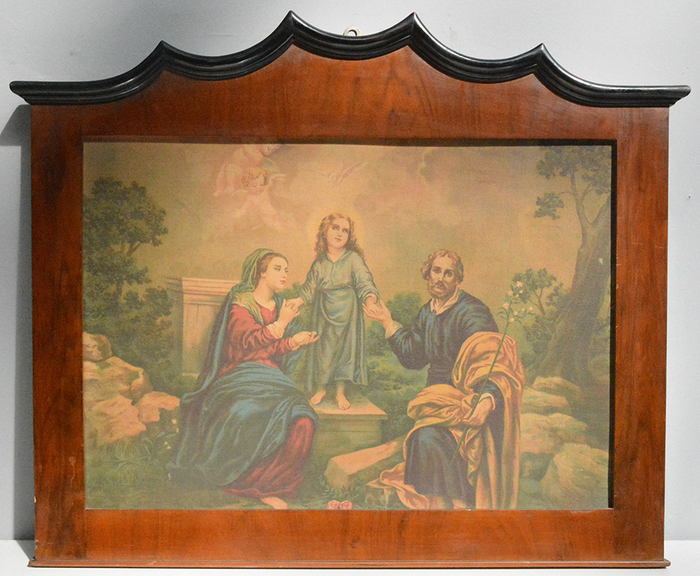 Cornice déco di gusto barocchetto ispirata agli stilemi di Piero Portaluppi in legno di noce massello con cimasa in legno ebanizzato. Montata con una stampa su compensato a soggetto religioso. Milano, anni '20. (cm 83,5x72,8) (lievi difetti) -EN Cornice déco di gusto barocchetto ispirata agli stilemi di Piero Portaluppi in legno di noce massello con cimasa in legno ebanizzato. Montata con una stampa su compensato a soggetto religioso. Milano, anni '20. (cm 83,5x72,8) (lievi difetti)