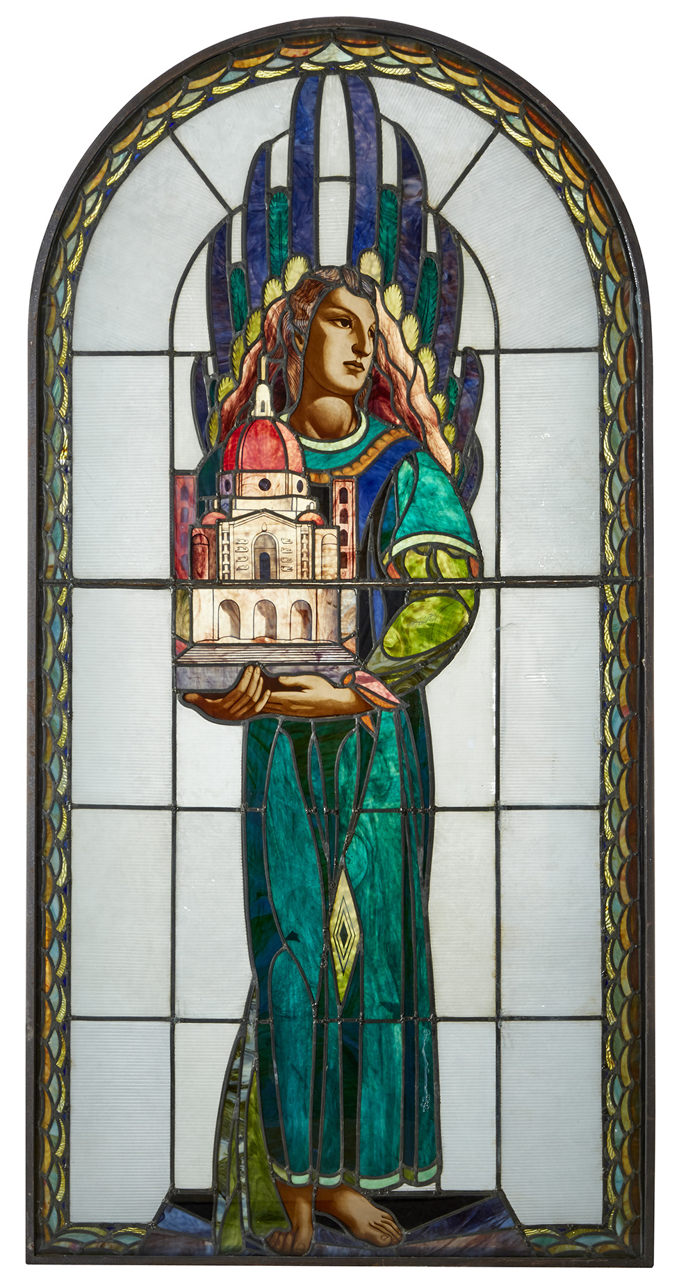 Ezio Lorenzo Fabio Giovannozzi (1882 - 1964) Grande vetrata con sommità ad arco, decorata con figura allegorica di angelo reggente il modello della cattedrale di Santa Maria del Fiore di Firenze. Esecuzione De Matteis, Firenze, 1920ca. Vetri policromi Monaco, traslucidi e variegati, vetro dipinto, fondo in vetri canneté trasparenti dipinti a smalto bianco. Protezione in vetri antisfondamento da ambo i lati. (cm 265x134) (lievi difetti e restauri) -EN Large glass panel with arched summit decorated with allegorical figure of an angel holding a model of the Cathedral of Santa Maria del Fiore in Florence. Execution by De Matteis, Florence, 1920ca. Polychrome Monaco glass, translucent and variegated, painted glass transparent cannete glass base painted white. Safety glass protection on both sides. (265x134 cm.) (slight defects and restoration)