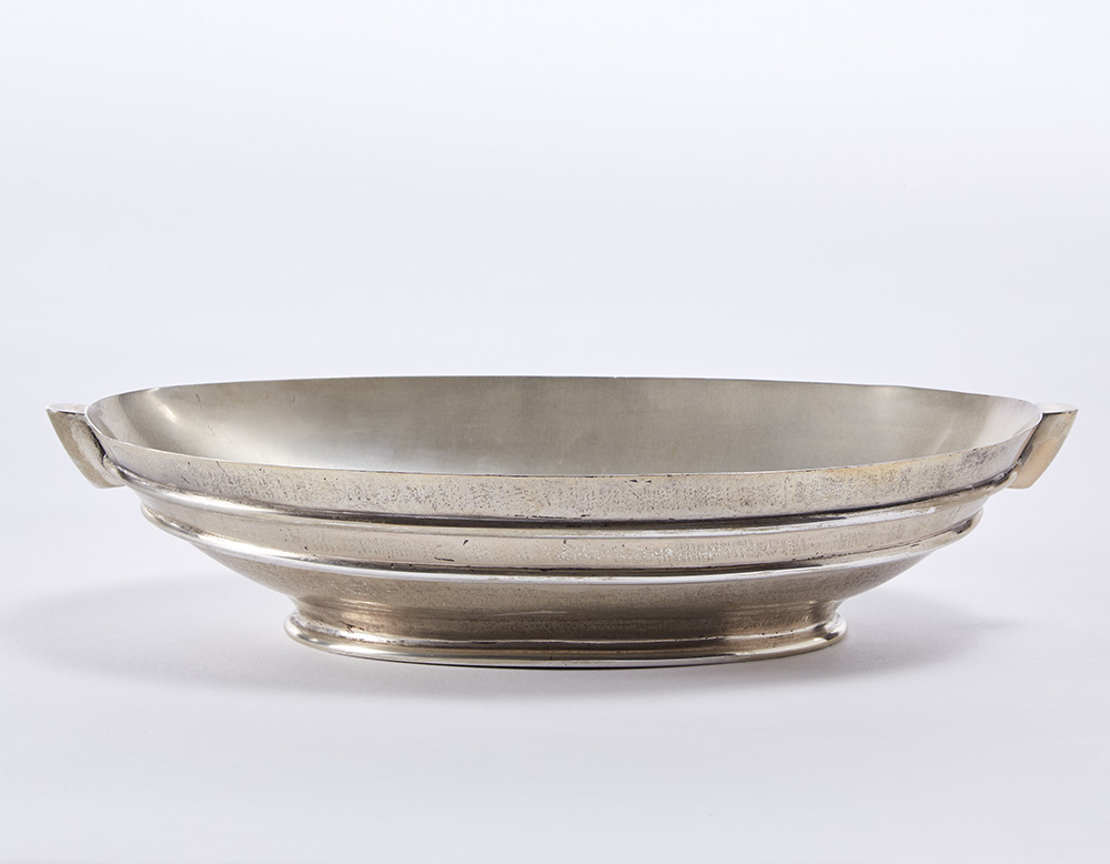 F. Chiappe Bacile déco con due piccoli manici in argento martellinato e profilato. Milano/Genova, 1925ca. Marcato a incussione sotto la base "F. Chiappe Genova Milano" e titolato "800". (gr 900 ca) (cm 34x8x20) (lievi difetti) Provenienza Collezione privata, Milano -EN A Déco bowl with two small silver handles. Milan / Genoa, 1925ca. Stamped to base "F. Chiappe Genova Milano" and marked "800". (900 ca. gr.) (34x8x20 cm.) (slight defects) Provenance Private collection, Milano