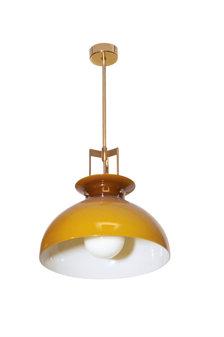 Lampadario con diffusore in vetro opalino giallo, montatura in ottone zapponato.