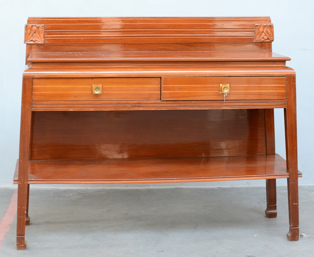 Piero Zen Mobile Liberty a due cassetti in legno di mogano con inserti intagliati, intarsi in legni diversi e madreperla. Milano, anni '10. (difetti) -EN Mobile Liberty a due cassetti in legno di mogano con inserti intagliati, intarsi in legni diversi e madreperla. Milano, anni '10. (difetti)
