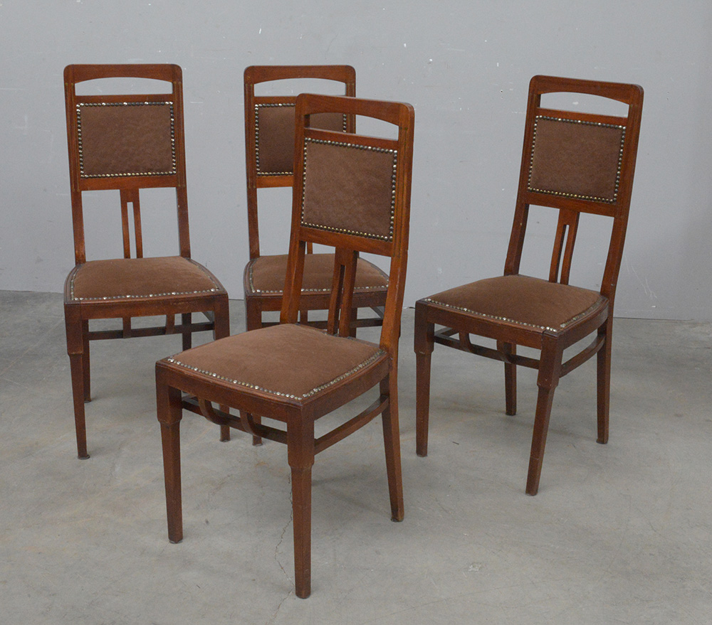 Gruppo di quattro sedie liberty in mogano massello con intarsi in ottone. Seduta e schienale imbottiti rivestiti di velluto marrone. Italia, 1905ca. (difetti e restauri) -EN Gruppo di quattro sedie liberty in mogano massello con intarsi in ottone. Seduta e schienale imbottiti rivestiti di velluto marrone. Italia, 1905ca. (difetti e restauri)