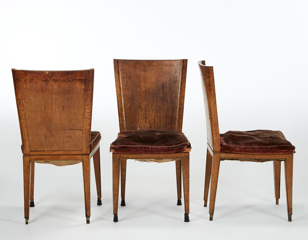 Osvaldo Borsani (Varedo 1911 - Milano 1985) (Attribuito) Tre sedie. Esecuzione Atelier Borsani, Varedo, anni '30. Struttura in legno massello con seduta imbottita rivestita in velluto bordeaux. (cm 46x89x46) (gravi difetti) -EN (Attribuito) Tre sedie. Esecuzione Atelier Borsani, Varedo, anni '30. Struttura in legno massello con seduta imbottita rivestita in velluto bordeaux. (cm 46x89x46) (gravi difetti)