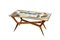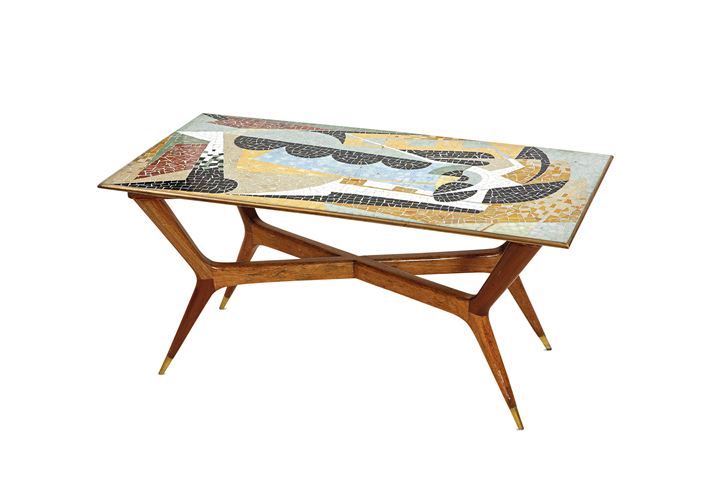Tavolino con struttura in legno di teak con puntali in ottone, piano in mosaico con decoro astratto.