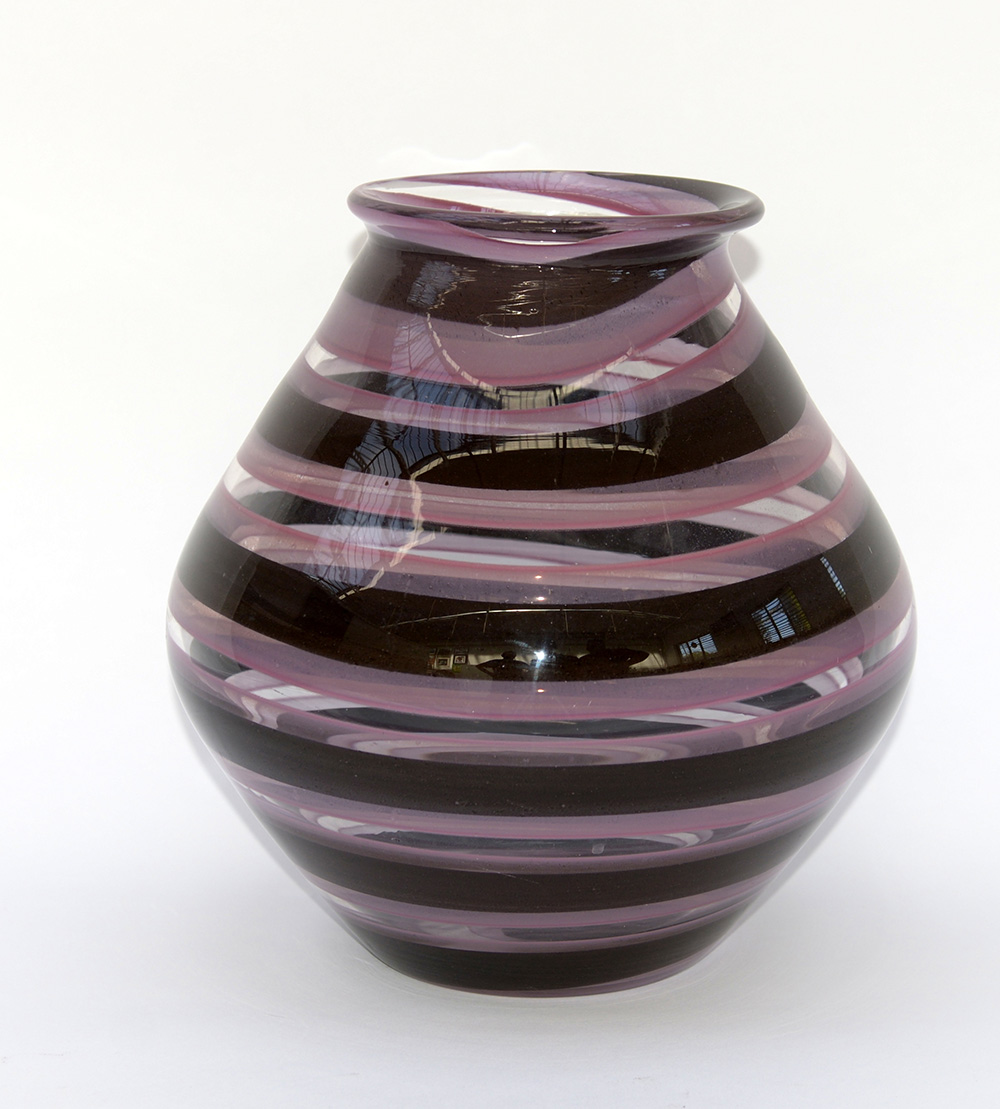 Manifattura di Murano. Vaso in vetro soffiato incolore a fasce spiraliformi in vetro rosa e bruno. Anni '70'/80. (h cm 29) (lievi difetti) -EN Manifattura di Murano. Vaso in vetro soffiato incolore a fasce spiraliformi in vetro rosa e bruno. Anni '70'/80. (h cm 29) (lievi difetti)